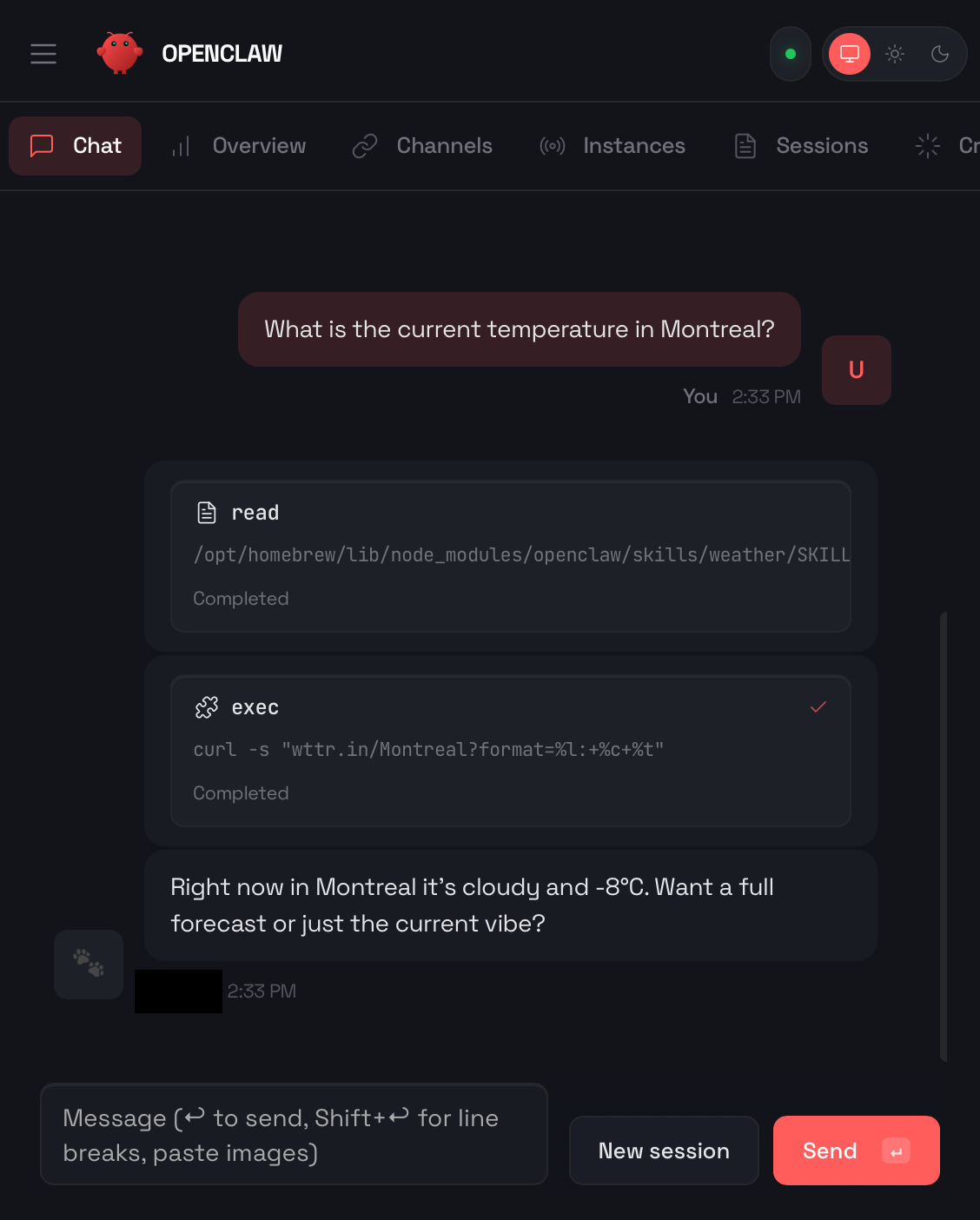 This architecture is what makes OpenClaw so powerful, it is not just a chatbot, but a full orchestration layer for AI-powered automation. The Gateway dashboard provides a clean, web-based interface without needing external messaging apps.
